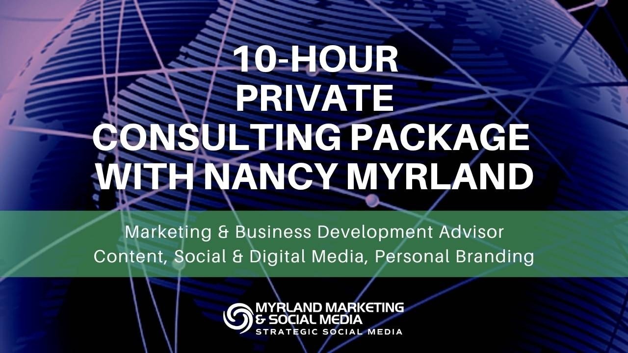 This discount package includes professional marketing, business development, content, social, and digital media marketing consulting for 10 hours with me, Nancy Myrland, President of Myrland Marketing & Social Media, and Founder of The Lawyers Marketing Academy.